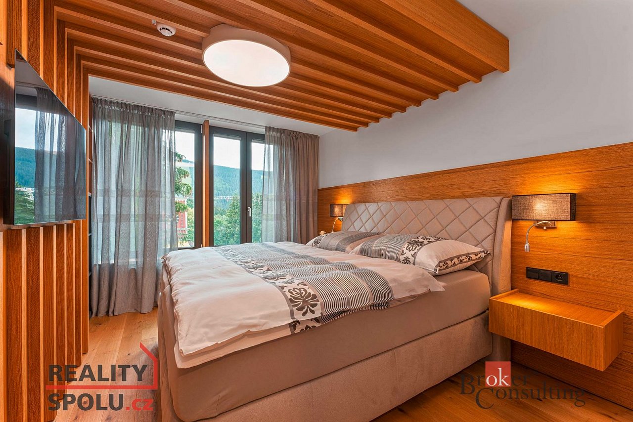 Až pro 4 osoby – ideálně 2 dospělé osoby a dvě menší děti, či jedno větší dítě. Prostorná stylová ložnice se dvěma lůžky a možností až dvou přistýlek – rozkládací sofa. Nechybí balkon se zahradním nábytkem a kompletně vybavená kuchyň a vlastní garážové stání, privátní úschovna lyží s vysoušečem bot.